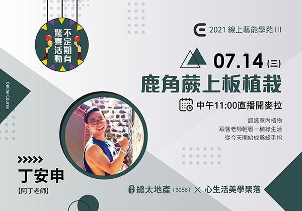 【藝能學苑線上直播課程 PART3】EP14 鹿角蕨上板植栽 - 丁安申 (阿丁老師) (2021-0714預告)